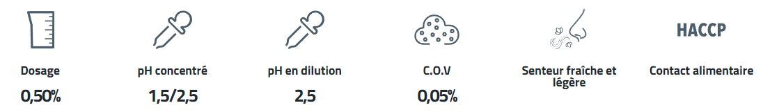 Ne pas appliquer sur les surfaces sensibles aux acides comme le marbre, le béton, le ciment, les bois huilés ou cirés. Il est recommandé de tester la compatibilité avec les matériaux sur une surface peu visible avant toute première utilisation.Activité et dosage préconisé : activité désinfectante à partir de 2 %.Pour réduire l’impact environnemental, respecter les doses recommandées d’utilisation.Diluer dans un pulvérisateur. Pulvériser sur une lavette et nettoyer les surfaces, laisser agir 5 à 30 min selon l’activité recherchée, essuyer. Rincer à l’eau potable lorsque les surfaces sont destinées à entrer en contact avec les denrées alimentaires (conformément à l’arrêté du 19/12/2013). Désinfection des sols : rinçage obligatoire et tester la compatibilité sur une petite surface avant toute utilisation. Utilisable en centrales de désinfection. Nettoyage des sols : de 0,5 % à 1 % max. Rincer le matériel d’application à l’eau claire après utilisation.