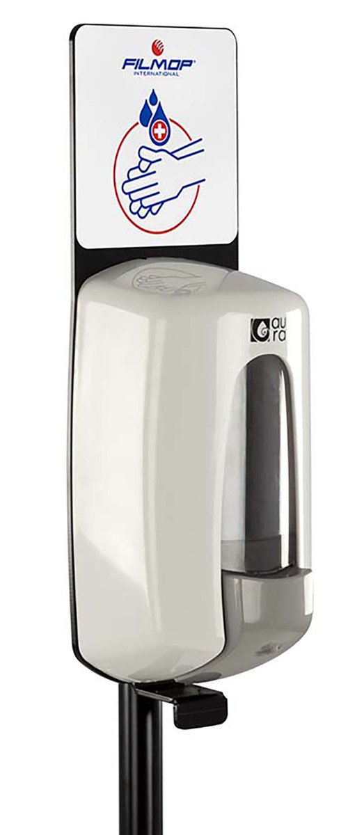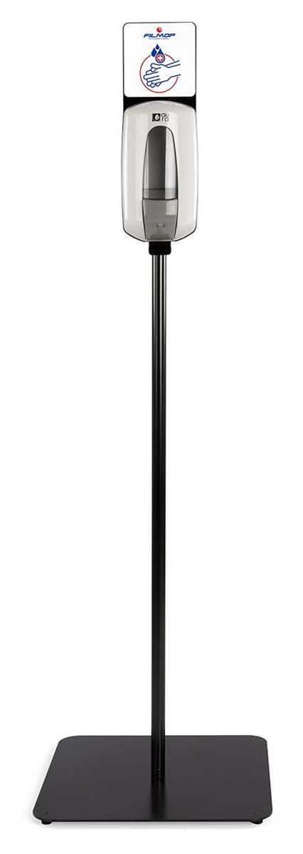 Ensemble de désinfection manuel, support stable en métal laqué avec distributeur JOLLY LINE intégré, pour un point d’hygiène prêt à l’emploi.